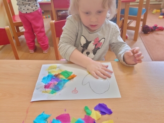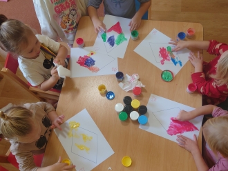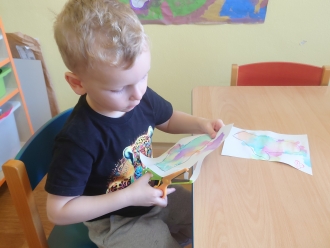 V listopadu jsme si s dětmi vyrobili papírového draka. Prstovými barvami jsme jej pomalovali a na dráčkův ocas jsme navlékali korálky. Papírový drak nás celý týden také provázel při ranní rozcvičce.