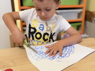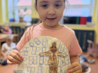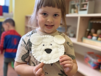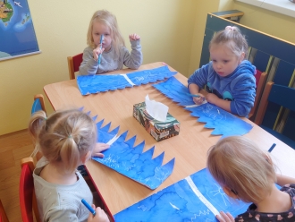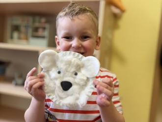 V posledním týdnu jsme se vypravili poznávat tajemnou zmrzlou zemi Grónsko. Grónsko jsme si nejprve ukázali na mapě, a pak jsme si povídali o tom, kdo v Grónsku žije. Namalovali jsme si vlastního Eskymáka a otiskem kostek jsme pro něj vyrobili iglú. Z papírových tácků jsme si vyrobili ledního medvěda.