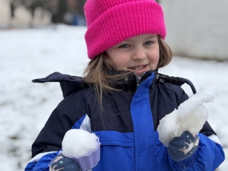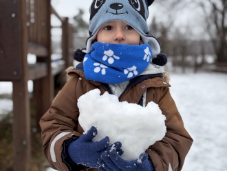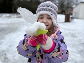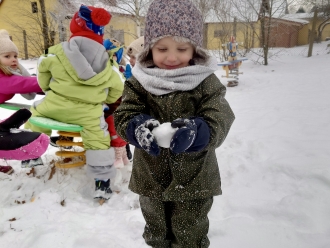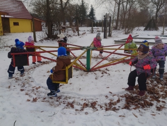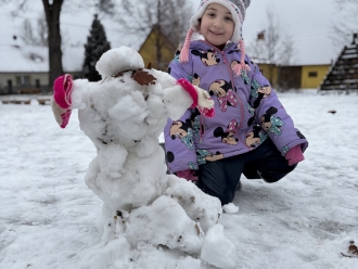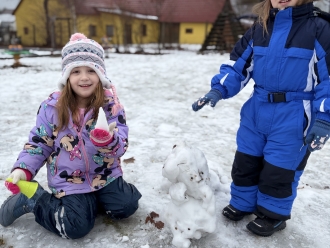 Druhým tématem byl Sněhuláček panáček. Naučili jsme se novou básničku o sněhulákovi, temperou jsme namalovali roztátého sněhuláka a dalšího jsme si vystřihli z papíru. Malé sněhuláky jsme si postavili na zahradě ze sněhu.
