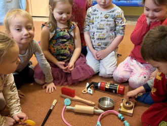 V následujícím týdnu nás čekalo téma povolání. Podle různých předmětů jsme se snažili uhádnout profesi. S elektrickou kombinační hrou jsme si zahráli na elektrikáře. 11. února jsme si připomněli mezinárodní den žen a dívek ve vědě a procvičili své schopnosti při práci s mikroskopem. Celým týdnem nás také provázely námětové hry na nejrůznější profese. Vyzkoušeli jsme si profesi lékaře, hasiče, kadeřníka, baristy a cukráře... Zatančili jsme si a zazpívali s kytarou.